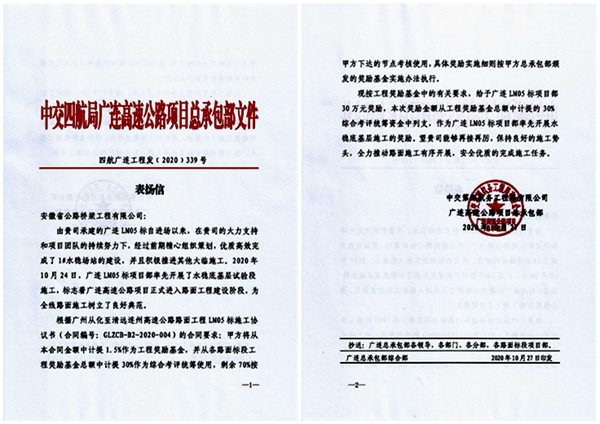 近日,中交四航局廣連高速公路項(xiàng)目總承包部發(fā)來表揚(yáng)信,對公司承建的廣連高速05標(biāo)優(yōu)質(zhì)高效完成1#水穩(wěn)場站建設(shè)和率先啟動水穩(wěn)底基層試驗(yàn)段施工給予表彰。