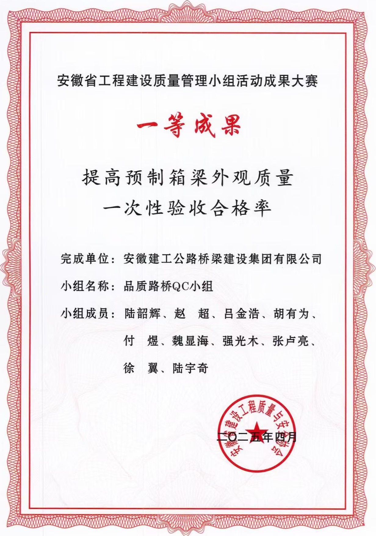 黨支部牽頭組建“品質(zhì)路橋”QC小組,聚焦預(yù)制箱梁外觀質(zhì)量痛點,對材料管理實行原材料進(jìn)場雙檢,針對性開展關(guān)鍵材料性能試驗;預(yù)制工藝嚴(yán)控模板拼裝精度,優(yōu)化混凝土振搗方式。改進(jìn)后,預(yù)制箱梁外觀合格率從89.67%提升至95.44%,每片修飾時間縮短2小時。成果《提高預(yù)制箱梁外觀質(zhì)量一次驗收合格率》獲安徽省QC成果一等獎,以“紅色匠心”護航工程品質(zhì)。