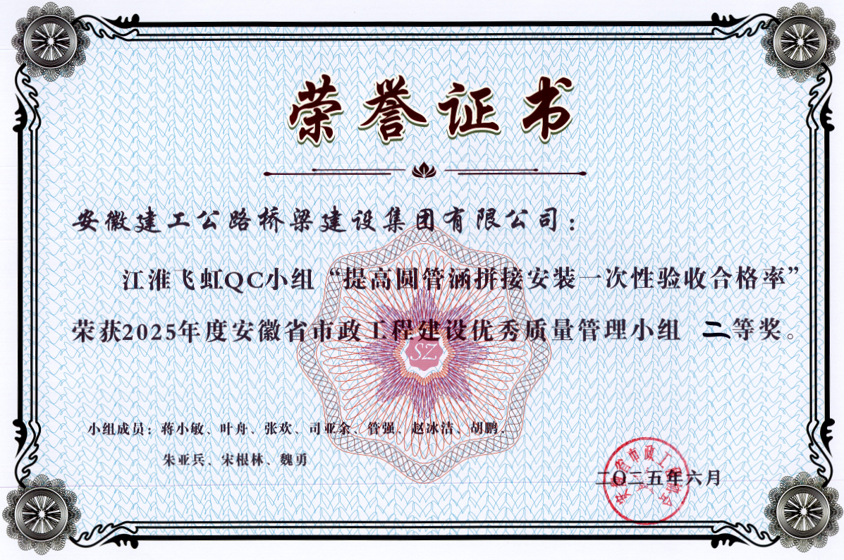 針對圓管涵等小結(jié)構(gòu)物外觀質(zhì)量通病,項目部成立“江淮飛虹”QC小組,聚焦混凝土質(zhì)量、模板工藝、振搗操作及養(yǎng)護(hù)管理等環(huán)節(jié)展開技術(shù)攻關(guān)。其課題《提高圓管涵拼接安裝一次性驗收合格率》顯著提升了施工進(jìn)度與實體質(zhì)量,一次性驗收通過省去了整改、復(fù)檢時間,確保圓管涵施工按計劃銜接后續(xù)工序,助力項目率先完成全線40道圓管涵施工;合格的拼接安裝減少了后期漏水、沉降、結(jié)構(gòu)開裂等隱患,提升了工程耐久性和質(zhì)量穩(wěn)定性。該成果有效降低了成本損耗、保障了工期推進(jìn),榮獲2025年度安徽省工程建設(shè)質(zhì)量與安全協(xié)會QC活動一等獎及安徽省市政工程建設(shè)優(yōu)秀質(zhì)量管理小組二等獎。