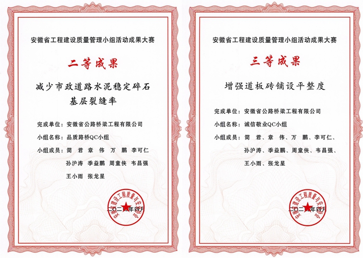 創(chuàng)新課題“積微成著”。憑借不同環(huán)境下的路基路面施工實踐,項目團隊持續(xù)開展技術攻堅和經驗萃取。在路面基層施工階段,通過嚴格控制石粉含泥量,成功避免水穩(wěn)碎石基層裂縫,基層壓實度全面控制在96%以上;在附屬結構施工中,項目團隊對人行道板磚使用及鋪設進行改良,提升了路面觀感和行走舒適度。這些源于項目一線的創(chuàng)新案例,不僅提升了項目的建設質量和效率,更為后續(xù)的項目建設提供了寶貴的經驗借鑒。相關QC成果在安徽省建設質量管理小組成果大賽中分別獲得二等獎和三等獎。