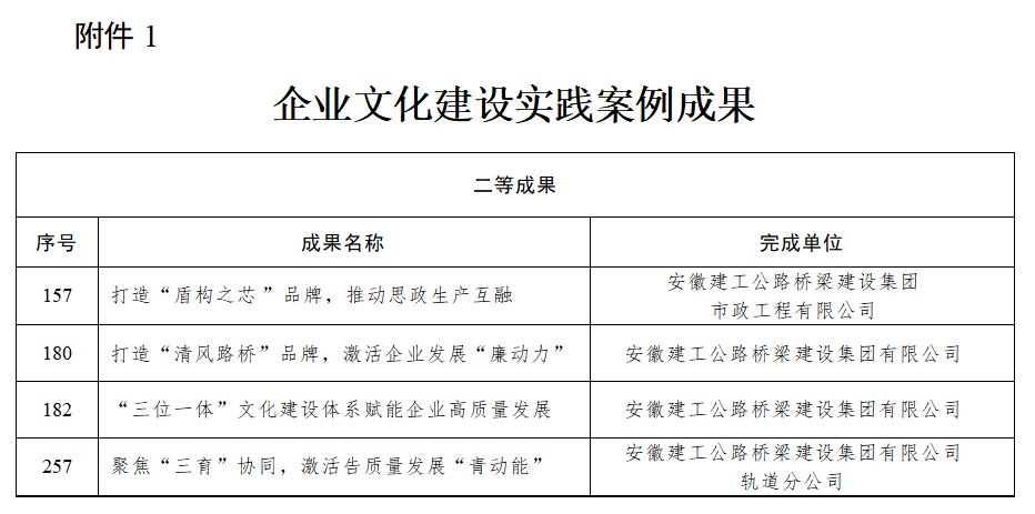 近日,中國(guó)施工企業(yè)管理協(xié)會(huì)發(fā)布2025年企業(yè)文化建設(shè)實(shí)踐案例成果,公司選送的案例《打造“盾構(gòu)之芯”品牌,推動(dòng)思政生產(chǎn)互融”》《打造“清風(fēng)路橋”品牌,激活企業(yè)發(fā)展“廉動(dòng)力”》《“三位一體”文化建設(shè)體系賦能企業(yè)高質(zhì)量發(fā)展》《聚焦“三育”協(xié)同,激活高質(zhì)量發(fā)展“青動(dòng)能”》,從全國(guó)1000余個(gè)參評(píng)案例中脫穎而出,成功入選企業(yè)文化建設(shè)實(shí)踐案例二等成果,充分展現(xiàn)了公司多年來(lái)在企業(yè)文化建設(shè)方面的累累碩果。