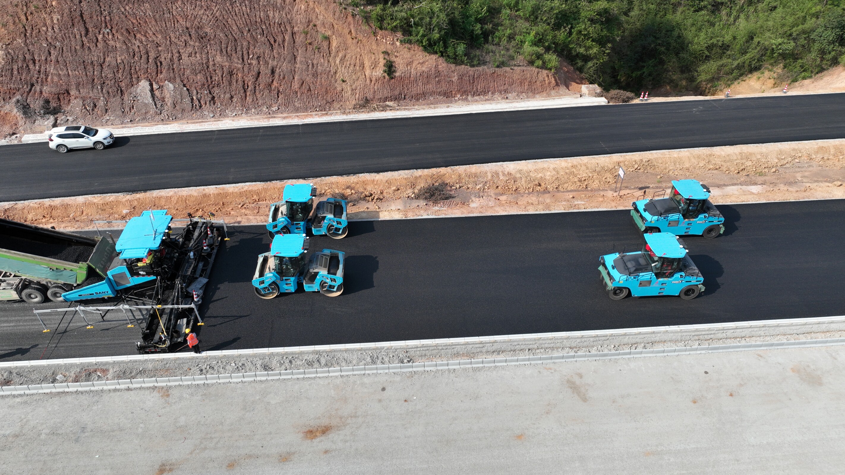 加快新設(shè)備運用。在涇青高速04標,繼瀝青中下面層成功運用“雙機聯(lián)鋪”技術(shù)后,項目在上面層施工中引入“無人攤鋪機群”,大幅提升了施工效率和質(zhì)量,獲得省公路學會的高度關(guān)注。在S334峨山路東延伸新建二期工程,項目采用激光攤鋪機進行橋面鋪裝,有效提高了攤鋪效率與平整度,為后續(xù)面層規(guī)模化施工打下堅實基礎(chǔ)。