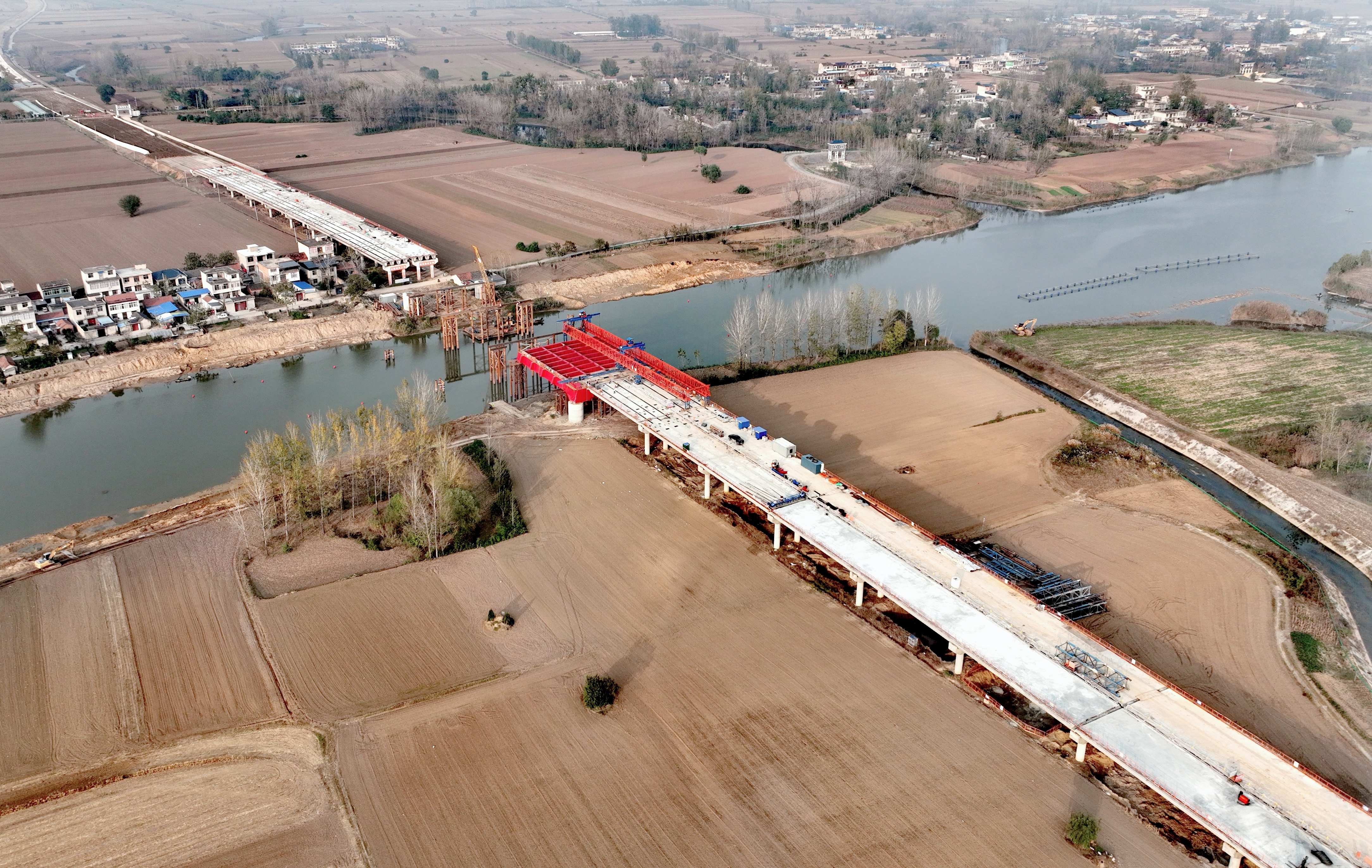 四季度以來(lái),項(xiàng)目已完成多座橋梁的梁板架設(shè)及現(xiàn)澆板澆筑,累計(jì)架設(shè)30米箱梁48片、T梁172片。重點(diǎn)控制性工程澮河大橋于10月11日完成首片鋼箱梁架設(shè),實(shí)現(xiàn)以20%工期完成32%產(chǎn)值的目標(biāo)。當(dāng)前,項(xiàng)目正加快推進(jìn)路基連續(xù)交驗(yàn)與水穩(wěn)規(guī)?;┕?,全面啟動(dòng)橋梁上部結(jié)構(gòu)施工。