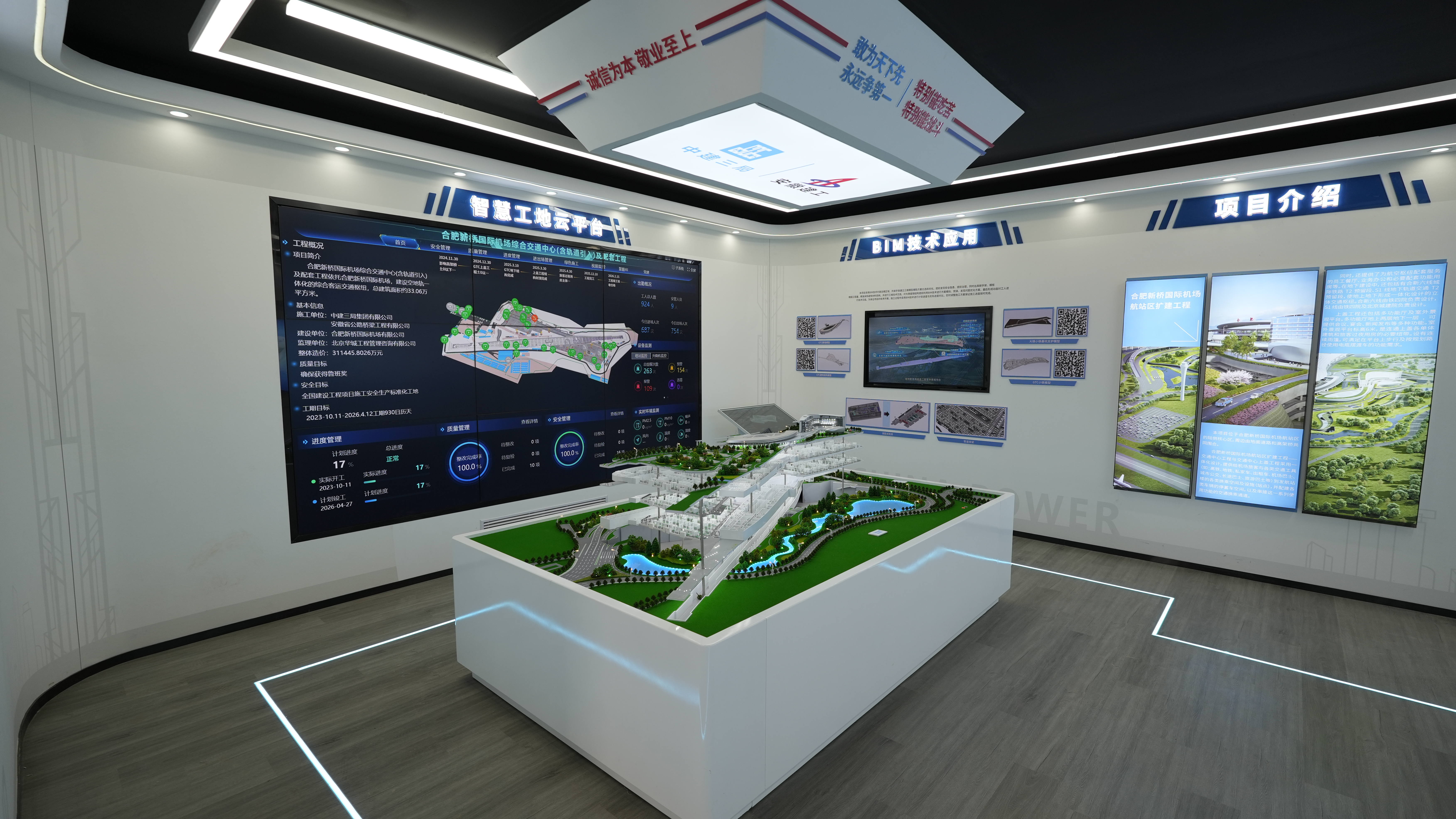 若說智能裝備是“單點(diǎn)突破”,數(shù)字協(xié)同平臺則實(shí)現(xiàn)了“全鏈貫通”。在合肥新橋機(jī)場綜合交通中心項(xiàng)目,依托品茗數(shù)字孿生系統(tǒng)搭建的BIM建管平臺,整合項(xiàng)目管理全維度數(shù)據(jù),構(gòu)建起參建方共享的“中央數(shù)據(jù)庫”。通過沙盤、LED投影、VR等技術(shù),實(shí)現(xiàn)項(xiàng)目全流程可視化管控,信息傳遞提升效率超60%。該技術(shù)憑借領(lǐng)先的協(xié)同管理能力,入選安徽省智能建造與建筑工業(yè)化協(xié)同發(fā)展新技術(shù)新產(chǎn)品名單,為大型復(fù)雜項(xiàng)目智慧管理樹立標(biāo)桿。