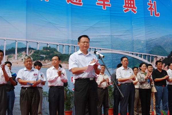 10時28分典禮正式舉行,來自兩岸的數(shù)千名群眾見證了這一激動人心的時刻。省交通運輸廳廳長梅勁、省公路局局長秦勤、省公路學會理事長李永鐸、六安市副市長楊光祥、金寨縣委書記沙洪虎、縣長夏倫平和四大班子成員、金寨縣各個鄉(xiāng)鎮(zhèn)主要負責人等領導出席了通車典禮。典禮由金寨縣委副書記、縣長夏倫平主持。來自我公司代表、金寨縣各單位代表共同組織了八個方陣參加了典禮。公司總經理汪衛(wèi)東應邀出席典禮,并參加了剪彩儀式。