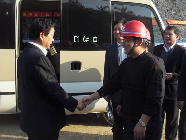 黃省長首先在施工現(xiàn)場聽取了績黃高速項目辦主任方昱對于工程建設情況的匯報。聽完匯報后,黃省長對公司和項目部的工作給予充分肯定和高度評價。他說,“省路橋公司是本省施工的龍頭企業(yè),代表本省的形象,希望你們再接再厲,繼續(xù)做好規(guī)范化施工,高效管理,抓住當前機遇,努力打造優(yōu)質工程,不斷提升企業(yè)形象,開辟新的市場,繼續(xù)做大做強?!蓖艨偙響B(tài),“省路橋公司在黃省長的關懷下,近年來企業(yè)改制改革方面取得了一定成效,企業(yè)取得了巨大發(fā)展,我們將繼續(xù)做好施工規(guī)范化、精細化管理,在省領導的關心與支持下,我們一定會抓住機遇、迎接挑戰(zhàn),把企業(yè)做大做強”。