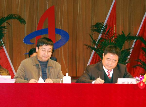 集團(tuán)公司董事長(zhǎng)、總經(jīng)理胡運(yùn)成與公司總經(jīng)理汪衛(wèi)東簽訂2010年生產(chǎn)、經(jīng)營(yíng)目標(biāo)責(zé)任書