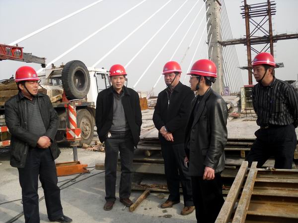 在大橋主跨施工現(xiàn)場,項(xiàng)目經(jīng)理江仲明向戴總一行詳細(xì)匯報(bào)了工程質(zhì)量、進(jìn)度、安全控制情況。戴總對(duì)我部當(dāng)前的工程進(jìn)展情況表示滿意,希望我部再接再厲,特別是在工程收尾階段不能松懈,要一如既往的做好各項(xiàng)工作,繼續(xù)加強(qiáng)文明施工,扎實(shí)推進(jìn)項(xiàng)目精細(xì)化管理。